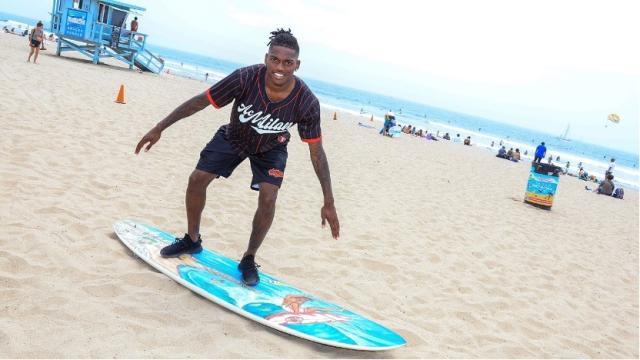去年夏天,已经成为AC米兰当家球星的莱昂,收到了两块冲浪板:第一块是与米兰完成续约的礼物,样式是红黑两色,上面还有米兰的队徽;第二块来自美国加州的威尼斯海岸,那是当地艺术家按照他的形象定制的版本。彩绘中的莱昂迎着波涛翻腾,现实里的莱昂在球场上冲浪,他或许依然没有学会在海上保持平衡的技术,但没有谁比他更适合代言这项运动。